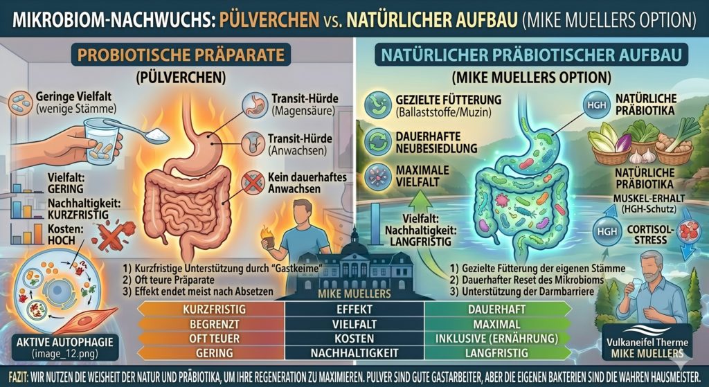 | Methode | Probiotische Präparate (Pulver/Kapseln) | Natürlicher Aufbau (Bad Bertrich Ansatz) |